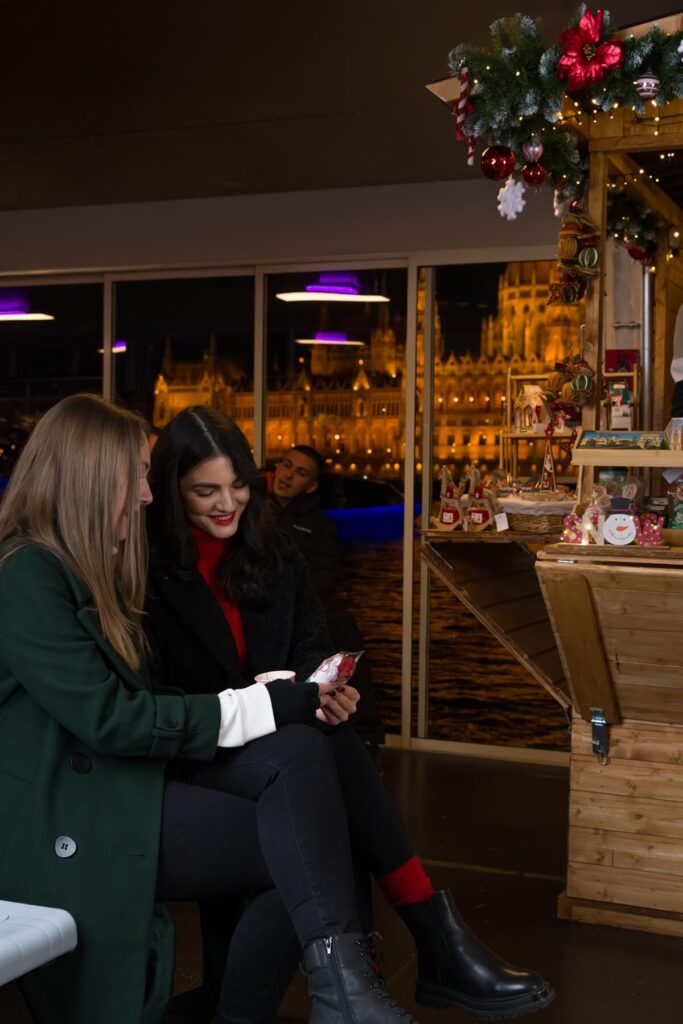 A fedélzeten egy meghitt kis vásár fogad, tele szuvenírekkel, apróságokkal, kedves csecsebecsékkel és a forralt bor melengető illatával. Minden vendéget egy gőzölgő pohár forralt borral vagy egy finom forró teával kínálunk az út során. A látványt az emeleten egy hatamas, gyönyörűen feldíszített karácsonyfa teszi teljessé, amitől az egész hajó ünnepi fényben ragyog. Kiválló lehetőséget biztosítva, egy-két remek selfie készítésére, a kivilágított Budapest bármely látványosságával.